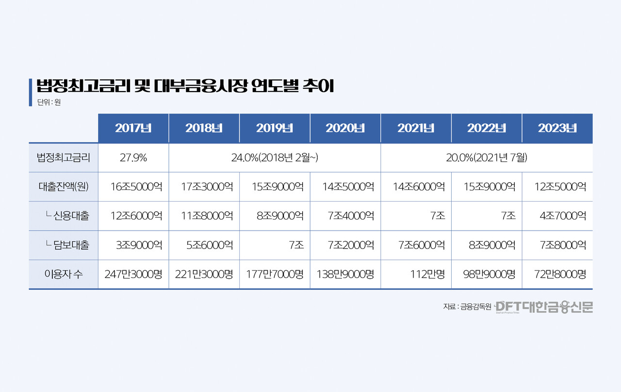 8일 한국대부금융협회 실태조사에 따르면, 대부업 시장은 최고금리 인하가 이어지는 동안 빠르게 위축됐다. 전체 대부업 대출잔액은 지난 2017년 16조5000억원에서 2023년 12조5000억원으로 4조원 가량 줄었다.
